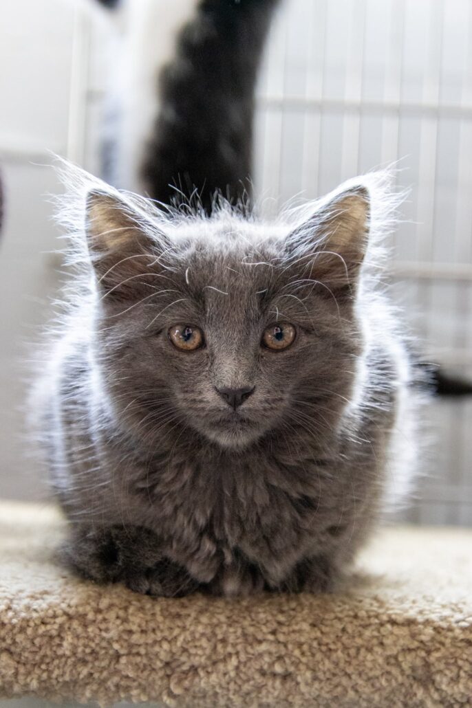 Blue gets along wonderfully with kids, other cats, and dogs, with the correct introduction – she’s a quiet companion with a whole lot of love to give.