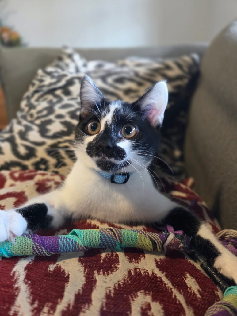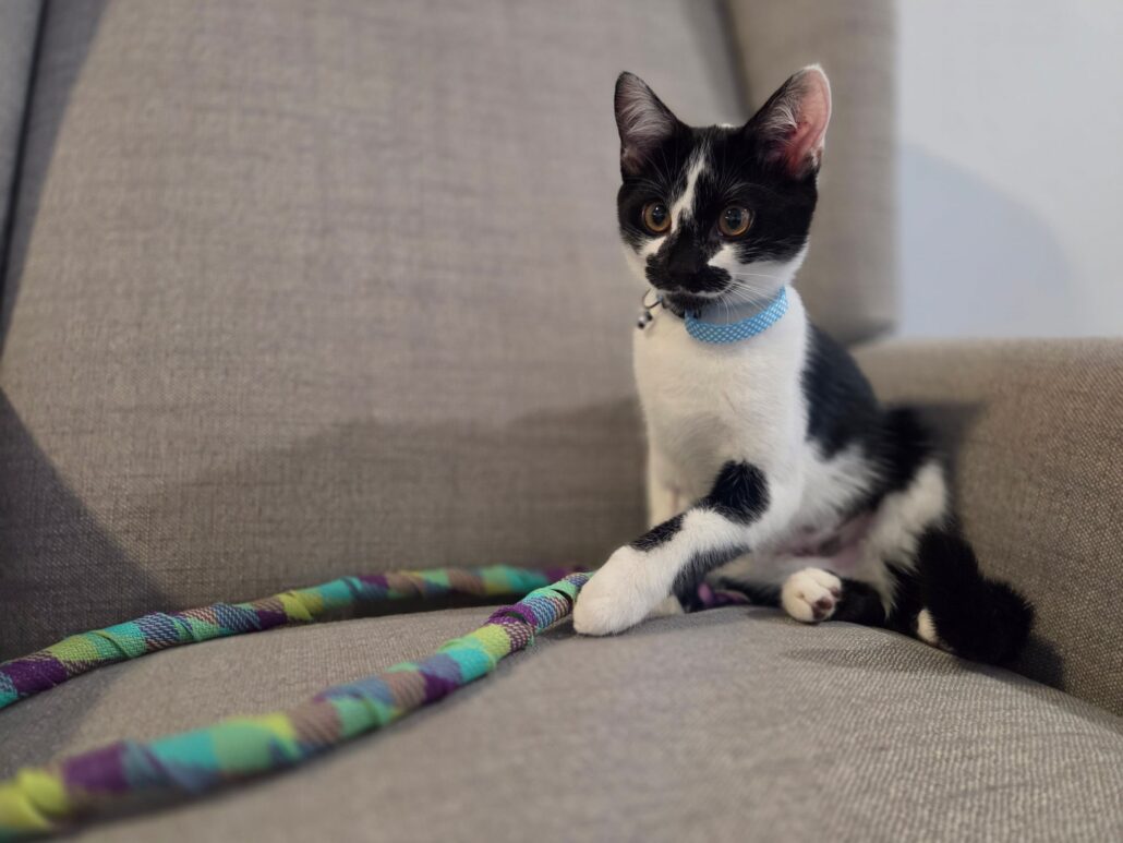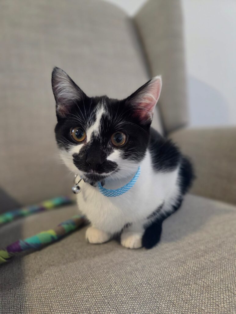 Charlotte’s favourite pastimes include snoozing on the couch, birdwatching from the window, and playing with her toys and her sister. Though she's growing up fast, she still has that playful, inquisitive kitten energy, and when she's tuckered out, she’ll curl up with her humans or find a cozy cushion to crash on.