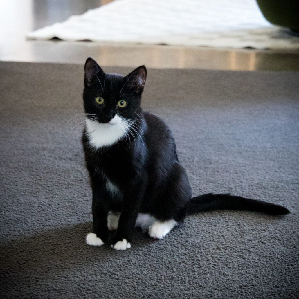 She gets along well with her kitten foster mate and the resident children, tolerates the grumpy old cat with bemused interest, and has chosen to pretend the dog doesn’t exist.