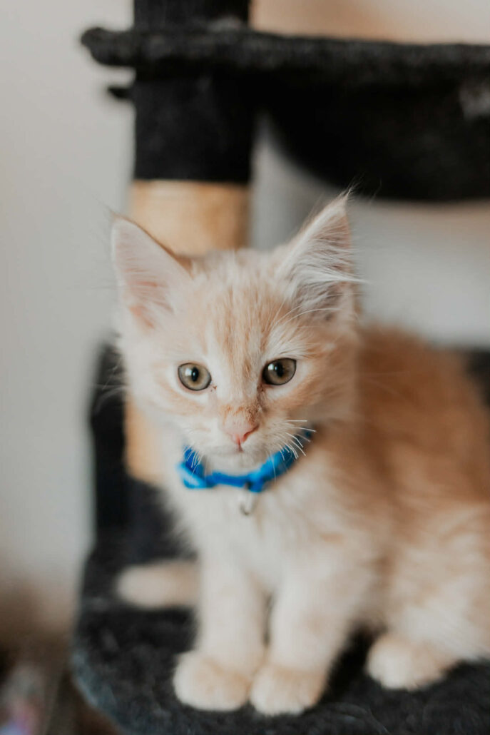 My main hobbies include sneak attacks on my sleeping siblings, chasing the tails of the resident cats, wrestling with anything that moves, and chasing bugs. But when I’m not wreaking havoc, I can be quite the charming little lad. I also love food and can be easily redirected with treats. I’ve been in foster care since I was quite young with my siblings, two adult feline foster siblings, and two adult resident cats, so it’s safe to say I get along well with kitty friends. I’ve also been around a friendly dog and gentle children, and I loved both.