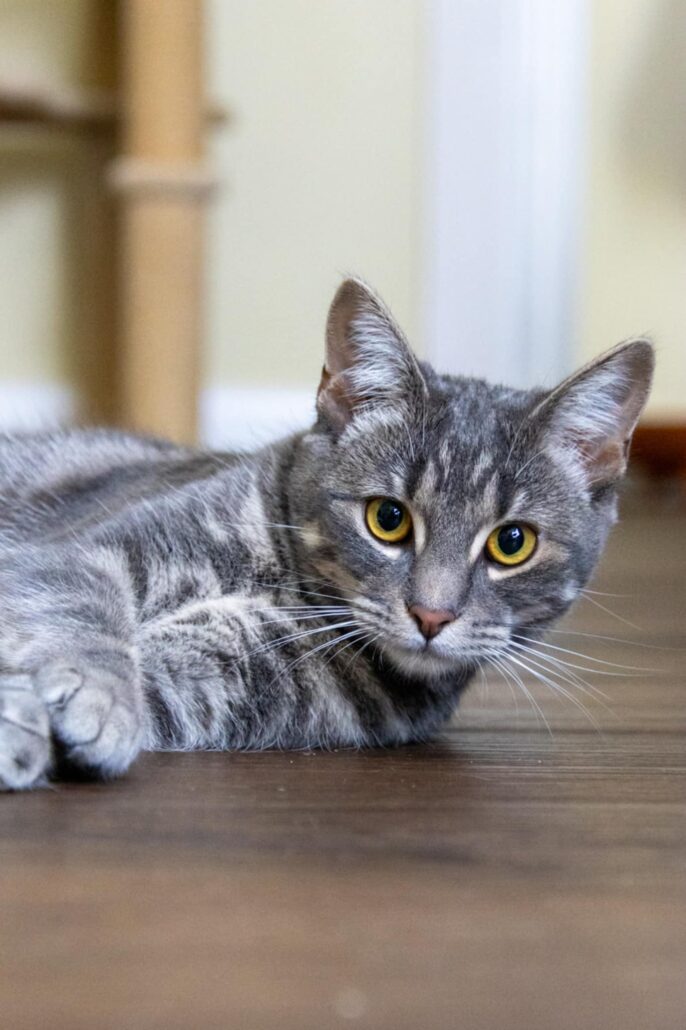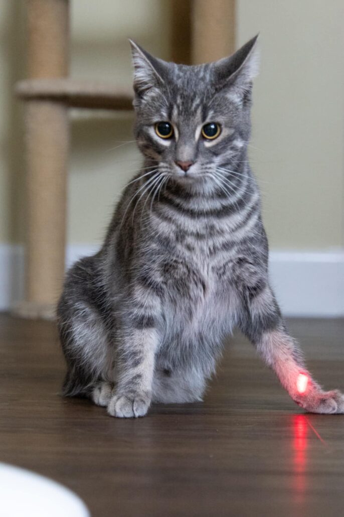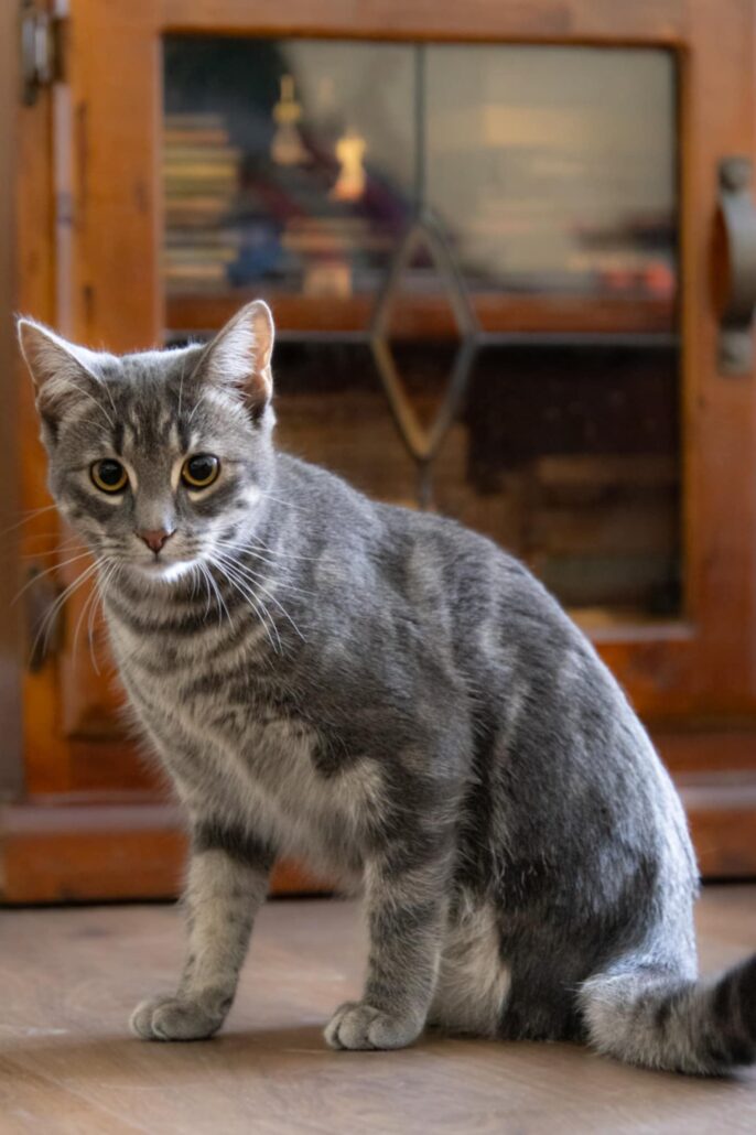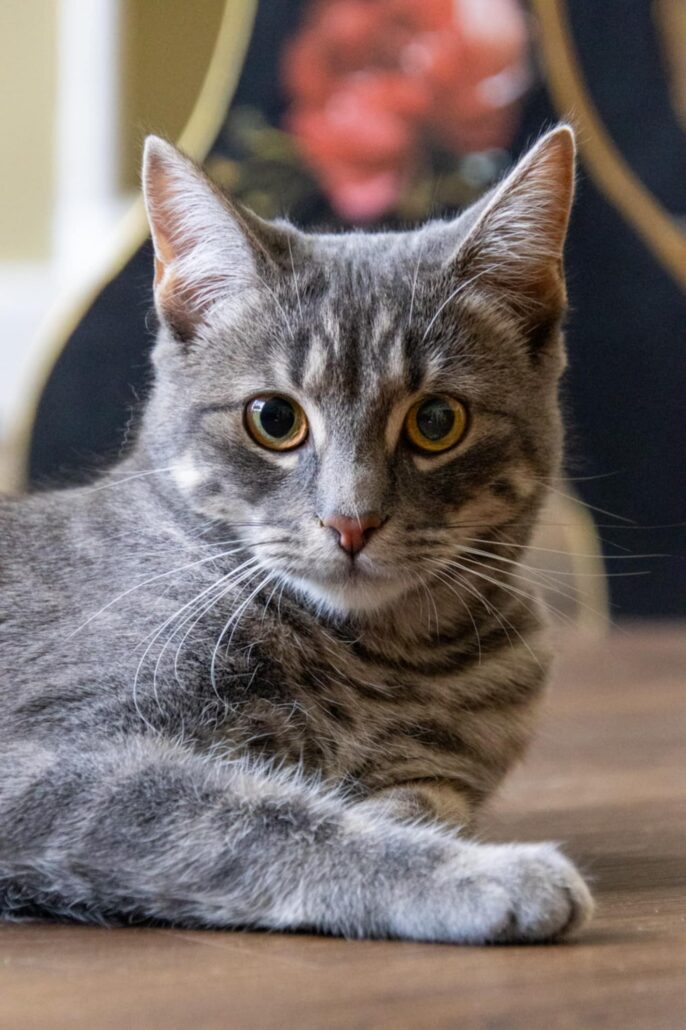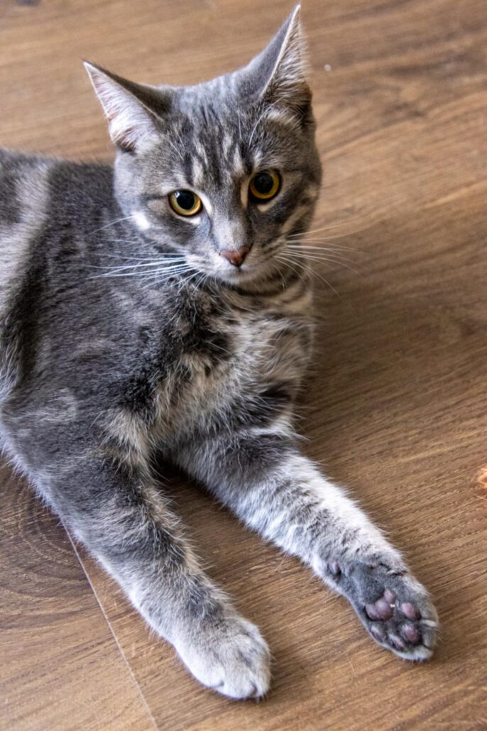 Sylvie is a pretty blue/grey girl with subtle silver stripes. A petite little girl who is lively on her feet despite only having three.